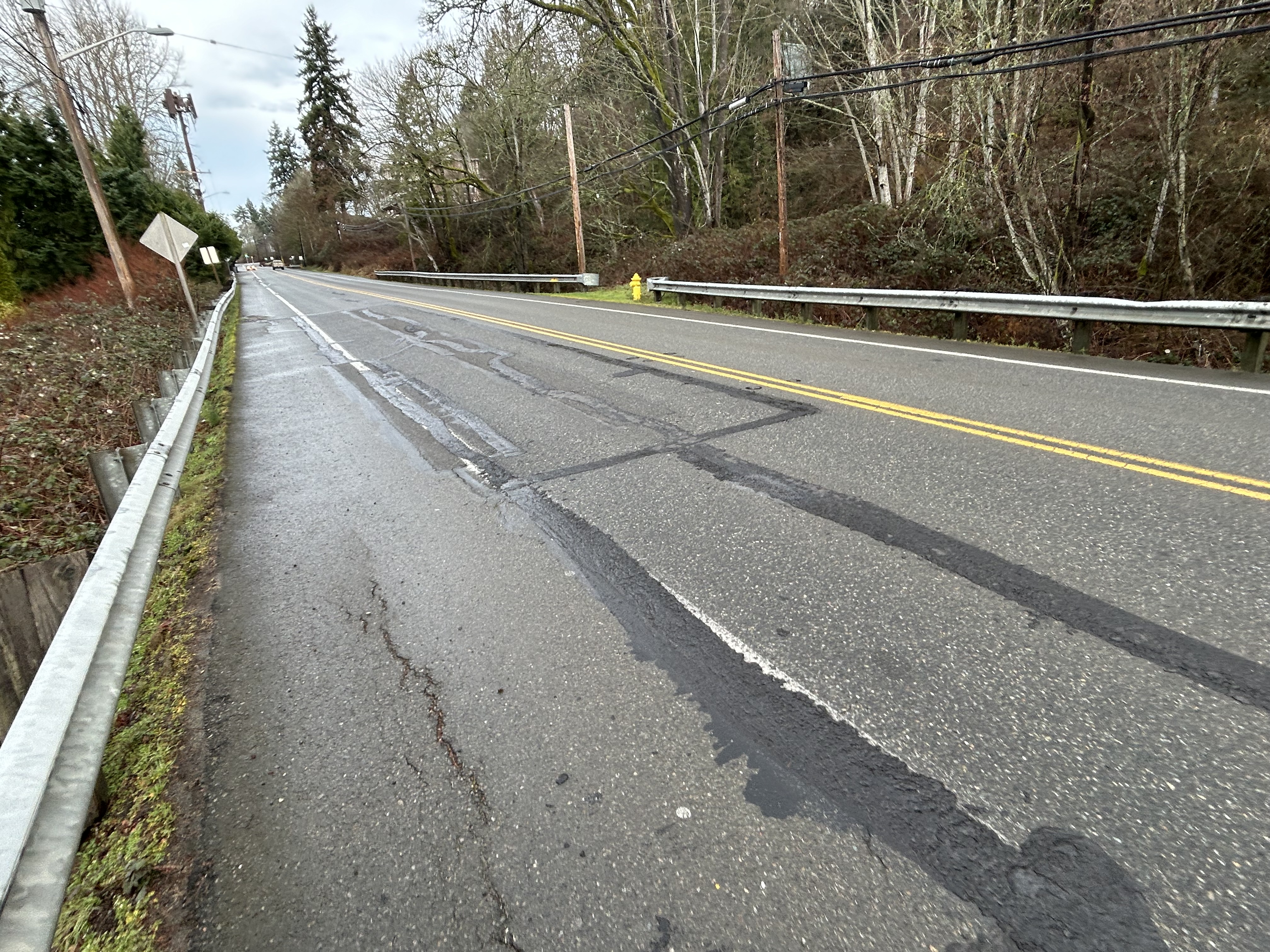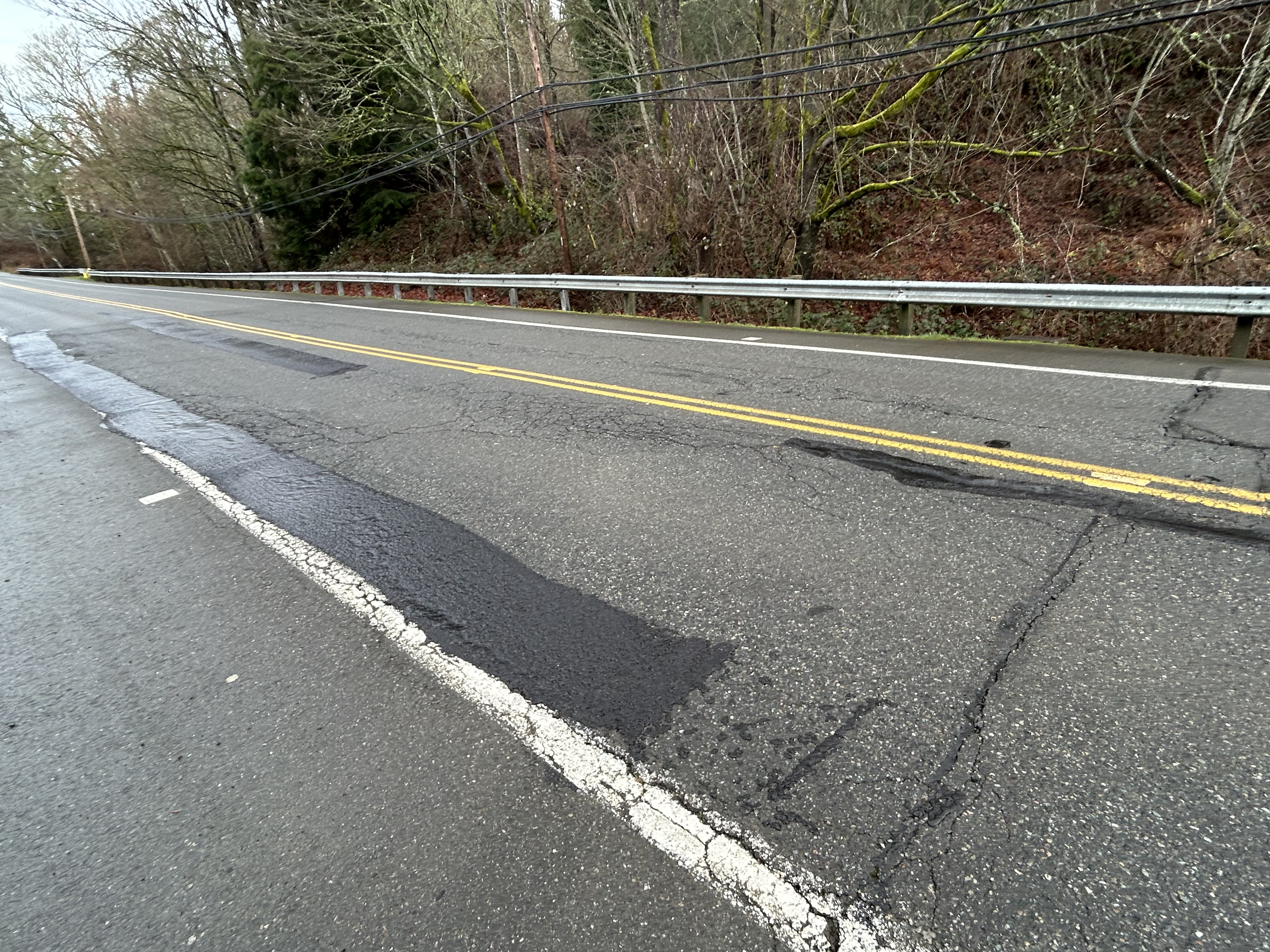 在这一部分观察到显著且持续的表面沉降和开裂,特别是在过去 7 年中。在此期间,南向车道的沥青路肩已沉降至 6 英寸,并已沿雾线从南向车道拉开。 道路恶化需要该市进行大量的维修工作并支付费用。岩土工程调查表明,沉降是由于松散填料的固结和路堤内地下公用管道的可能退化造成的。此外,堤坝可能建在湿地或渗漏区域的顶部。因此,随着路堤填土的继续整合,预计沉降将继续进行。 下面的照片显示了道路的现有状况。