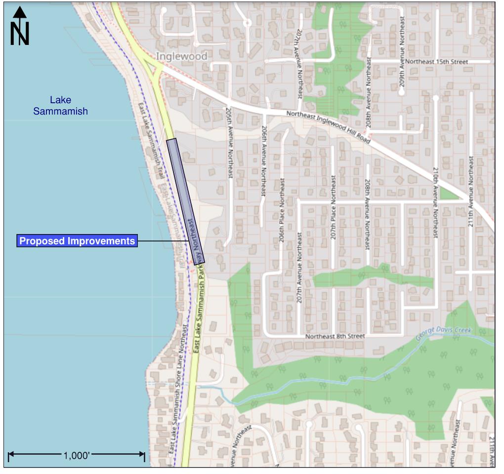 东萨马米什湖公园大道 (ELSP) 位于萨马米什湖东岸,在北部的 SR-202 和南部的 I-90 之间延伸。在过去 7 年中,一段道路经历了沉降,该项目计划稳定沉降路堤。ELSP 道路稳定项目位于与 NE Inglewood Hill Road 交叉口以南约 800 至 1,600 英尺处。该路段是一条次要干道,由每个方向的单车道组成。该位置的道路由一个 10 到 15 英尺高的路堤组成,西侧是陡峭的斜坡,东侧是湿地。地下公用设施包括下水道总管、水总管和地下水涵洞,位于路堤内。