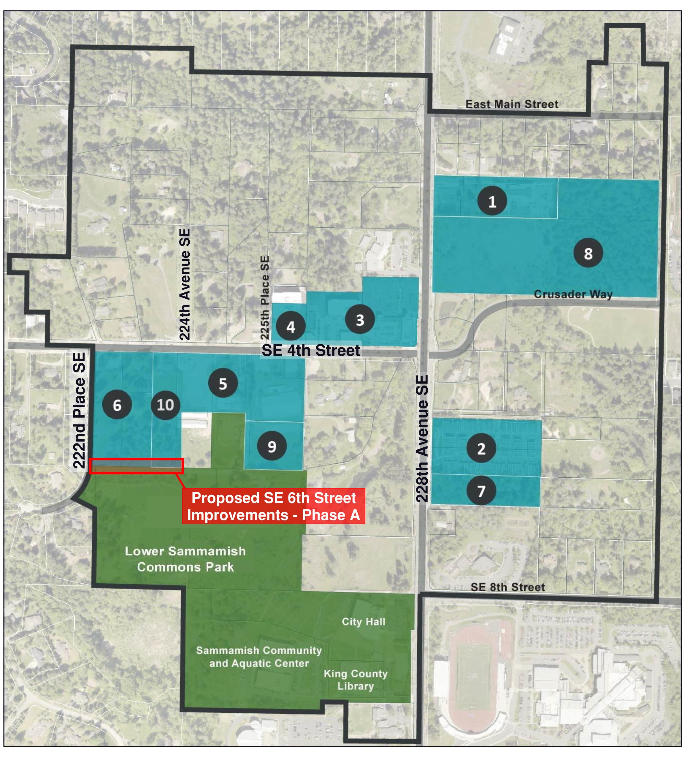 SE6th Street Improvements - Phase A 项目将包括建造一条新的公共街道,该街道将沿着 Sammamish Commons Park 的北端延伸,位于 222nd Place SE 和 224th Avenue SE 之间。新街道将为行人、骑自行车者和车辆提供可用空间。